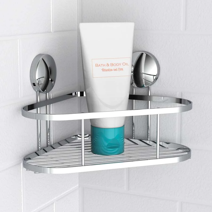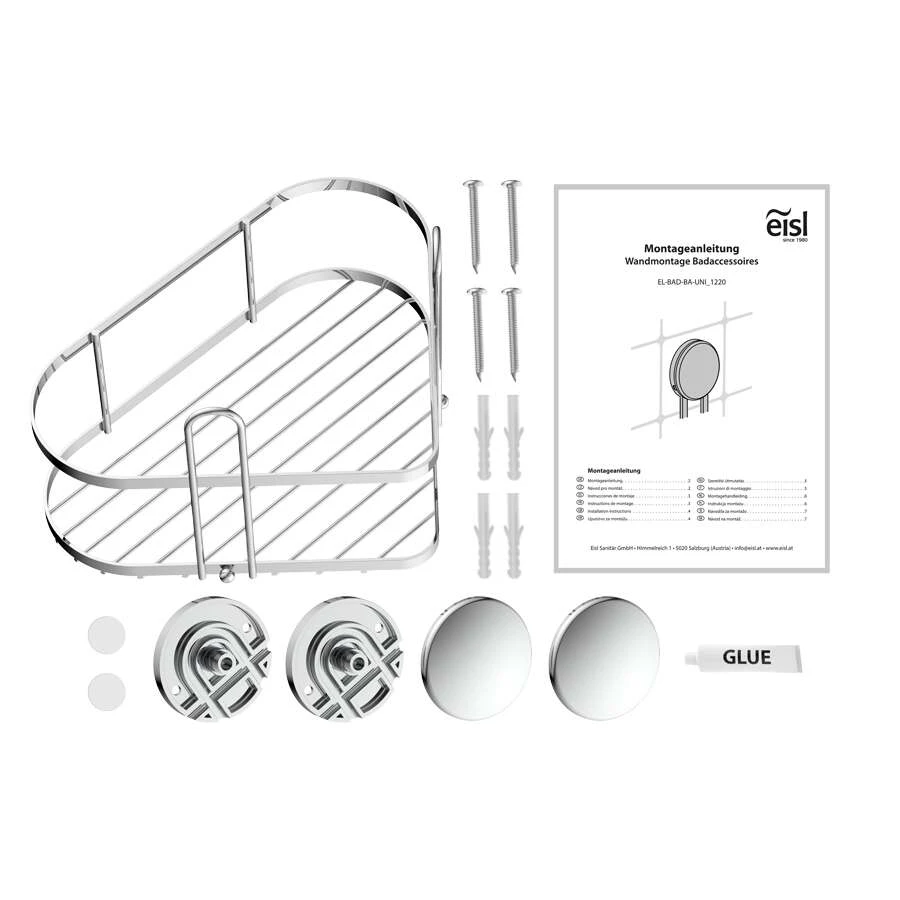 Das Montageset zum Kleben ist eine enfache und stabile Befestigung und vermeidet Beschädigungen am Untergrund – Gerade im Fliesenbereich eine praktische Lösung. Das Eckregal ist besonders geeignet für Duschen mit einem geringen Platzangebot. Vom Shampoo, Duschgel und Cremes bis hin zum Nassrasierer findet trotzdem alles seinen Platz und ist schnell griffbereit. Und mit seinen 25 kg ist es ein echtes Schwergewicht beim Thema Belastbarkeit. ,Unser Duschkorb ohne Bohren wird ganz einfach mit dem beiliegenden Kleber auf den vorher gereinigten Fliesen fixiert. Ein zusätzliches Klebepad hält das Eckregal an Ort und Stelle bis der Kleber nach 48 Stunden ausgehärtet ist. Natürlich lässt sich die Klebebfestigung auch wieder demonitieren und der Kleber rückstandsfrei entfernen. Du möchtest die Duschablage lieber mit Schrauben fixieren? Kein Problem, das Montageset beinhaltet auch Dübel und Schrauben. Je nach Oberflächenbeschaffenheit kannst du wählen: Kleben oder bohren? Der Aufbewahrungskorb Bad ist aus Edelstahl gefertigt, hochwertig verchromt und korrosionsbeständig. Die Edelstahlstreben auf der Ablage lassen das Wasser schnell ablaufen und verhindern Kalk-und Schmutzablagerungen durch Wasseransammlungen. Die Zwei-Punkt-Befestigung sorgt für Sicherheit und Stabilität.
