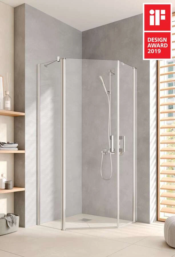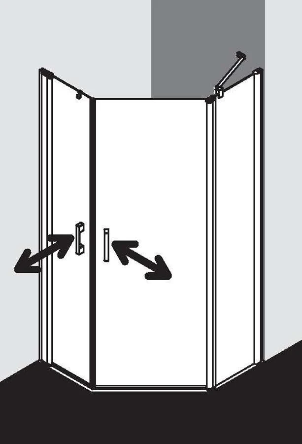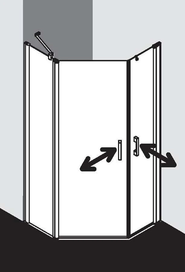 - Teilgerahmte Fünfeck-Duschkabine mit zwei Glasflügeln, mit einem Festfeld.