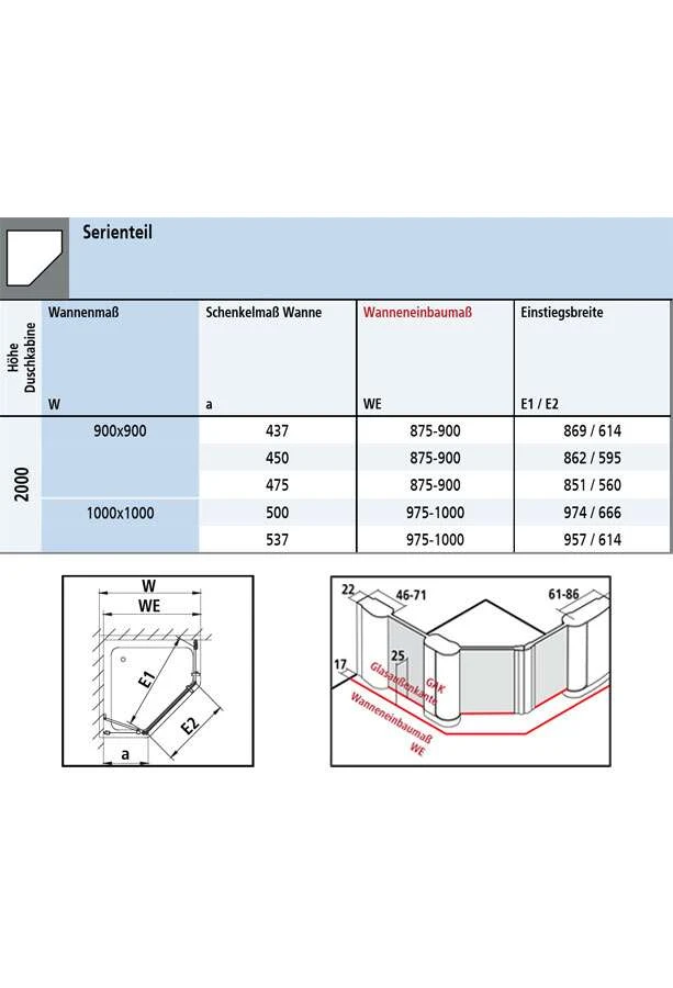 Eine Duschkabine im Standardmaß wird immer kürzer als angegeben gefertigt, z. B. ca. 860 mm statt 900 mm. Fordern Sie vor der Bestellung Ihren passenden Fliesenspiegel an.