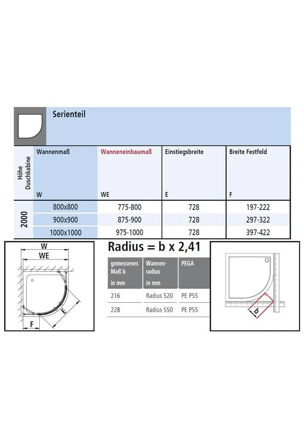 Eine Duschkabine im Standardmaß wird immer kürzer als angegeben gefertigt, z. B. ca. 860 mm statt 900 mm. Fordern Sie vor der Bestellung Ihren passenden Fliesenspiegel an.