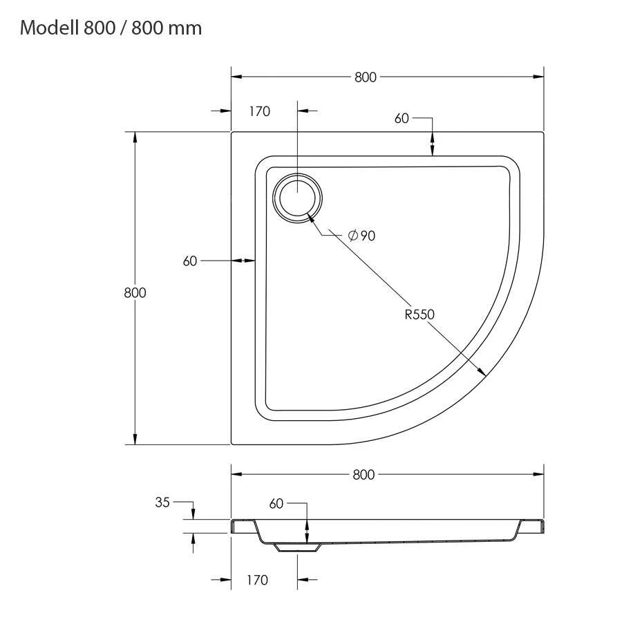 - Länge: 900 mm / Breite: 900 mm / Höhe: 170 mm / Radius: 550 mm