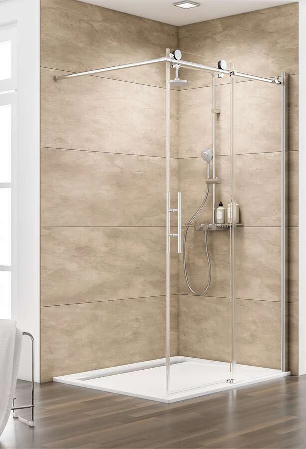 - Breite der Stabilisierungsstange 980 mm gemessen vom Glas des Festelements bis zur Wand (Bügel kürzbar auf jede beliebige (kürztere) Breite)